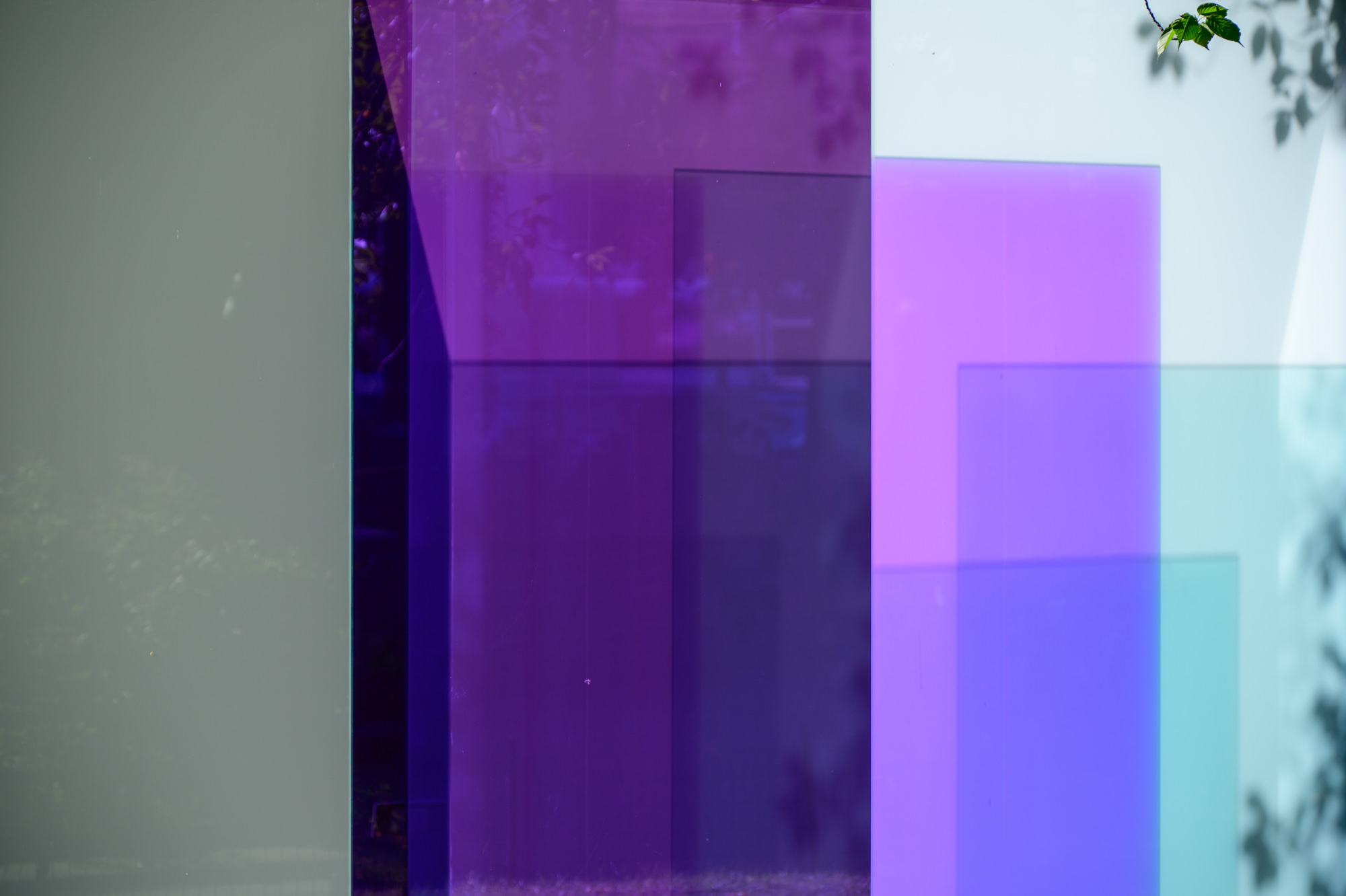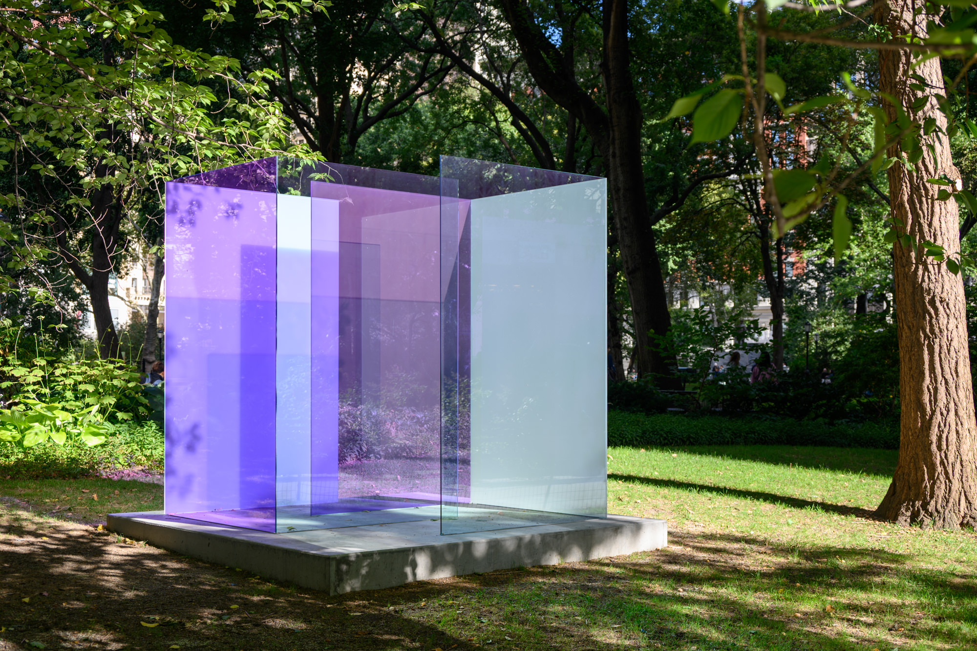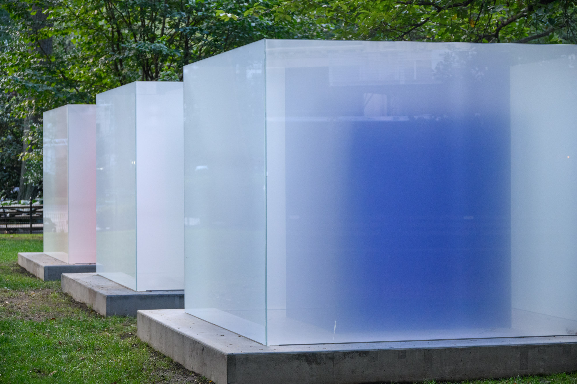 Bell began using glass in the 1960s, creating mirrored cubes atop clear Plexiglas bases. He is interested in glass because “it did three things that nothing else that I knew of did,” he recalls. “It transmitted light, it absorbed light, and it reflected light all at the same time.” By the mid 1960s Bell expanded the scale of his small cubes into six-by-eight-foot “Standing Walls” consisting of upright glass panels, situated on the ground, in various formations such as cubes, sails, and channels. He combines these forms with color, created either by fusing colored film inside of the glass like those at the park or using a vacuum process that adheres metal vapors to the surface, creating mirror-like effects.