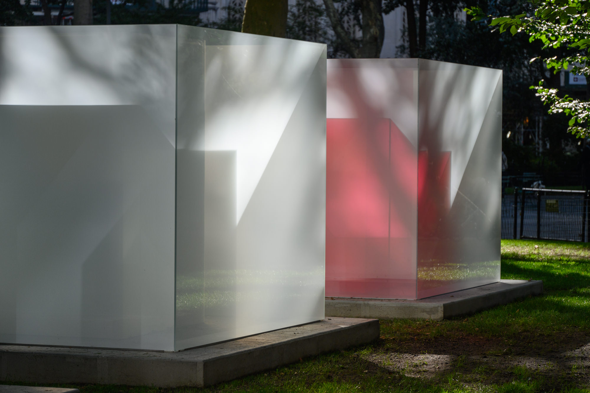 NYC’s Madison Square Park has hosted excellent art commissions and exhibitions over the decades. For the ’25/’26 winter season, Larry Bell has installed six sculptures made of chromatic glass that form a visual conversation with the surrounding greenery and cityscape.