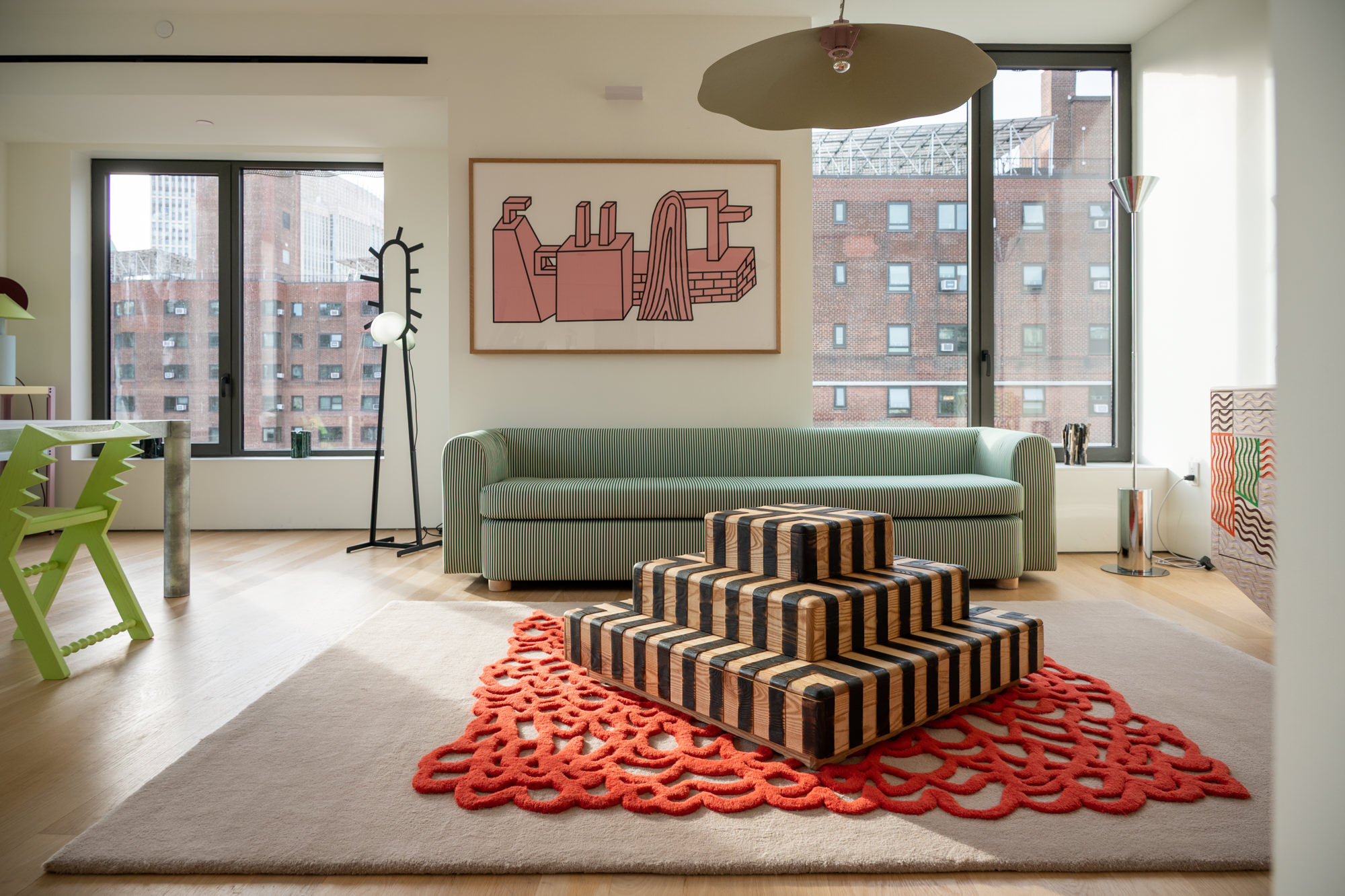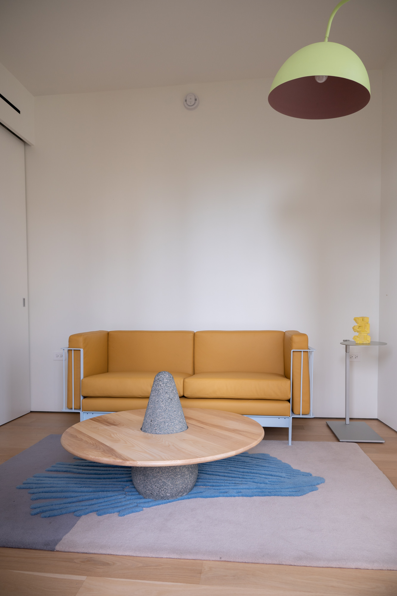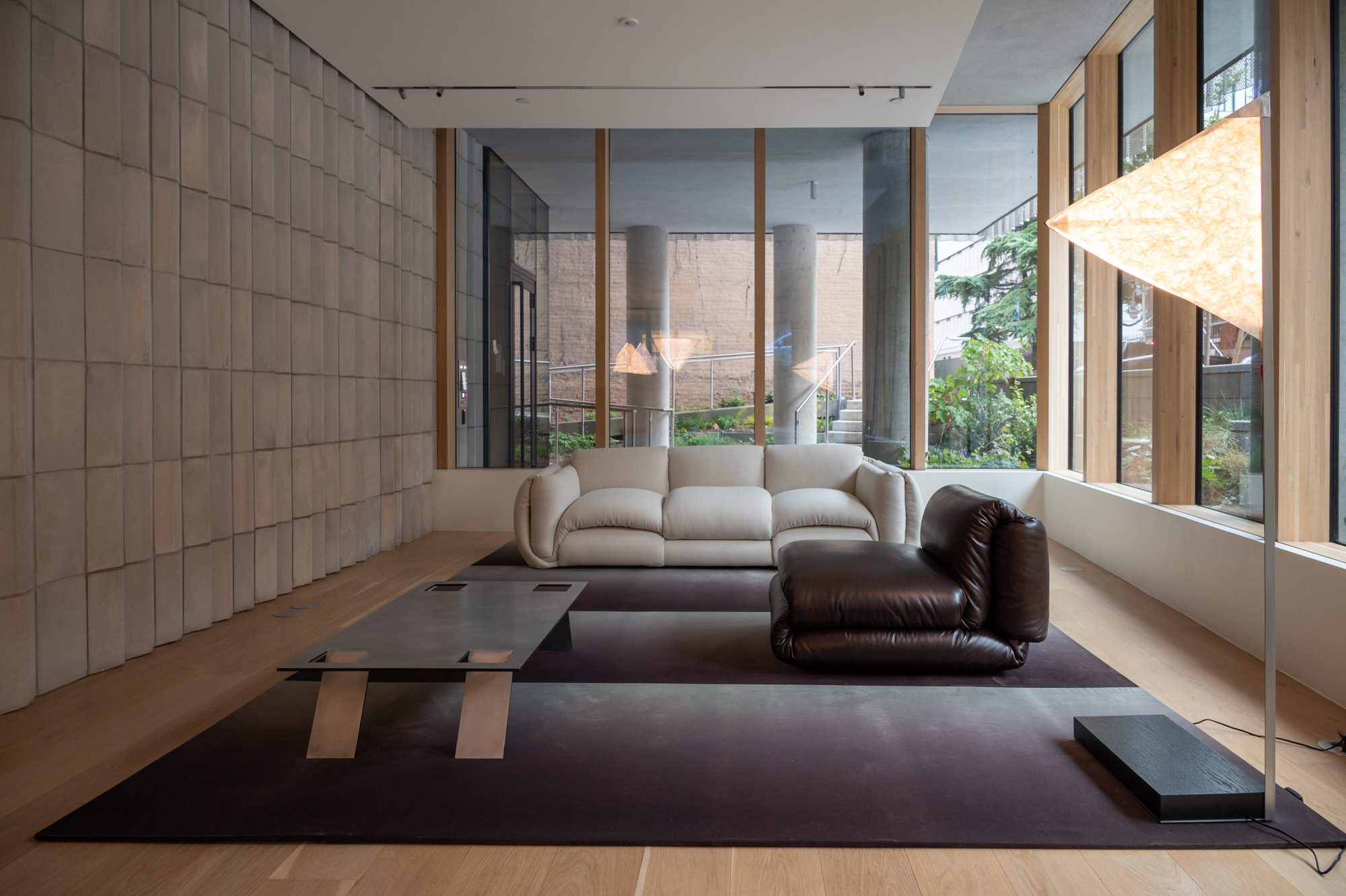 Furniture and lighting from Estudio Persona occupies the ground floor lobby. The sofas from the new Abrazo collection favor soft forms that tuck into each other over a rigid structure.