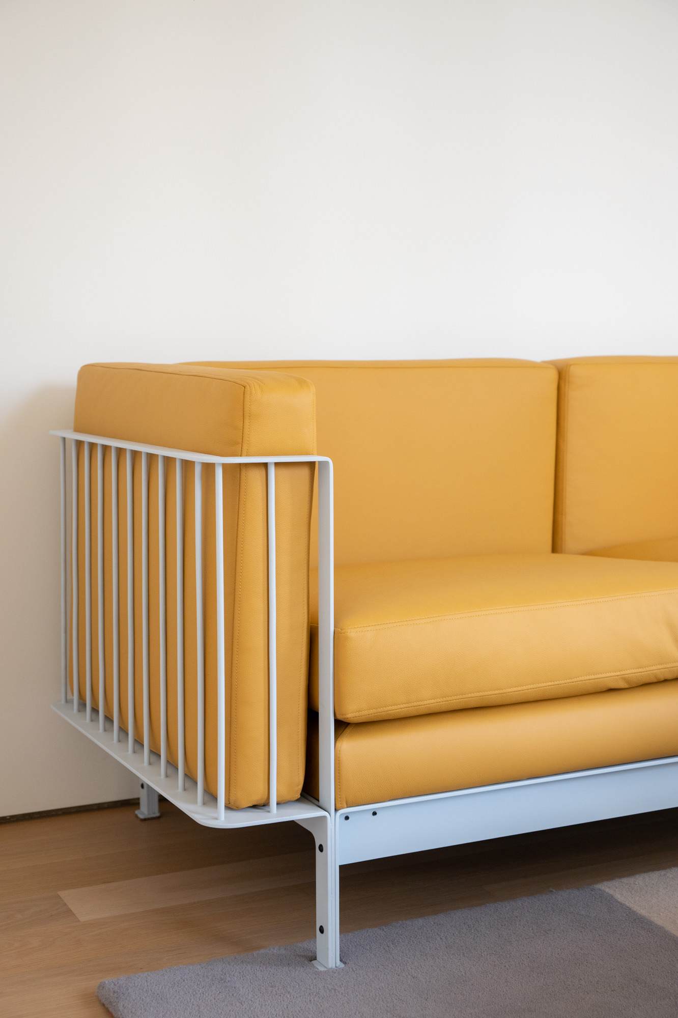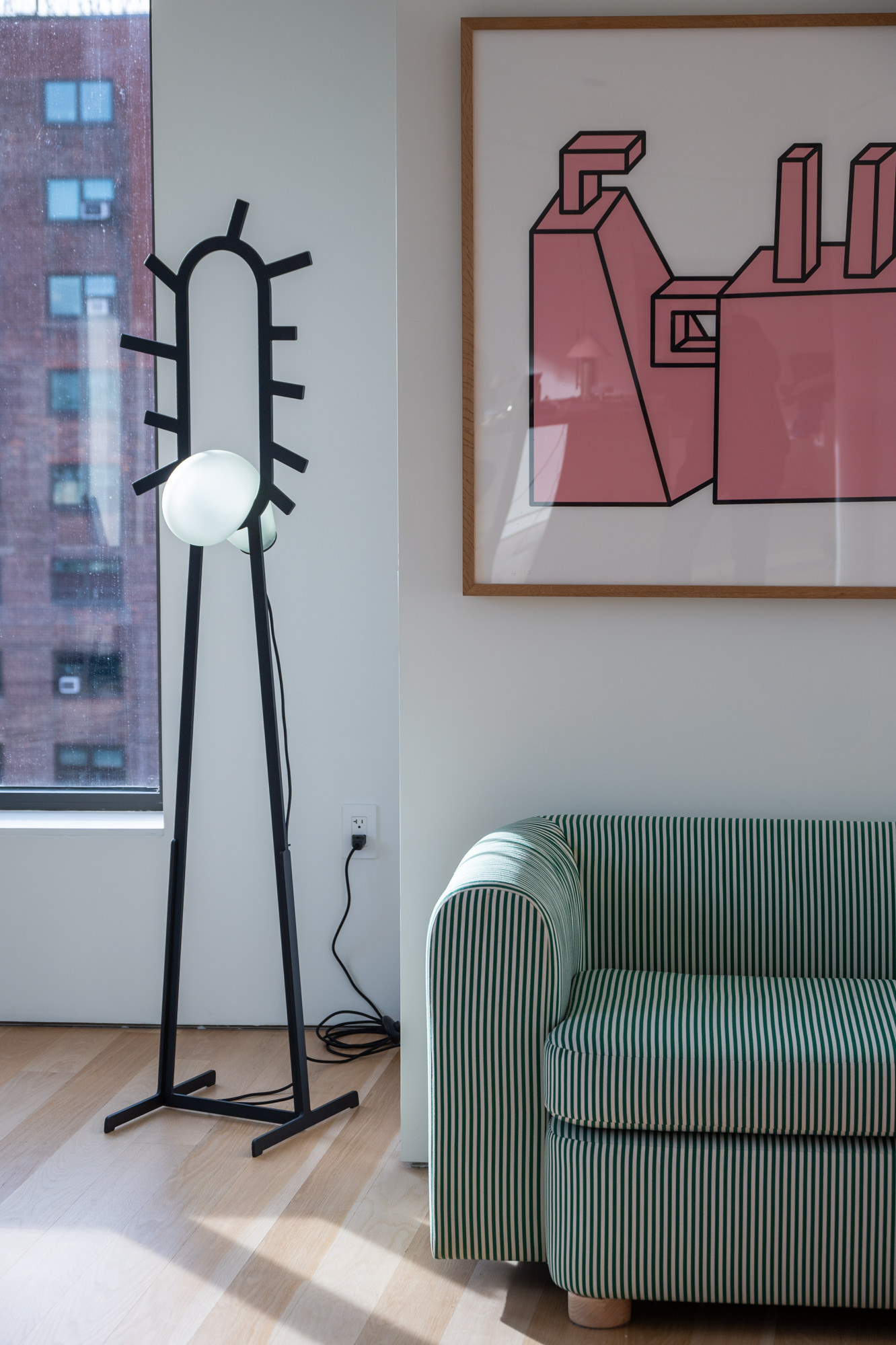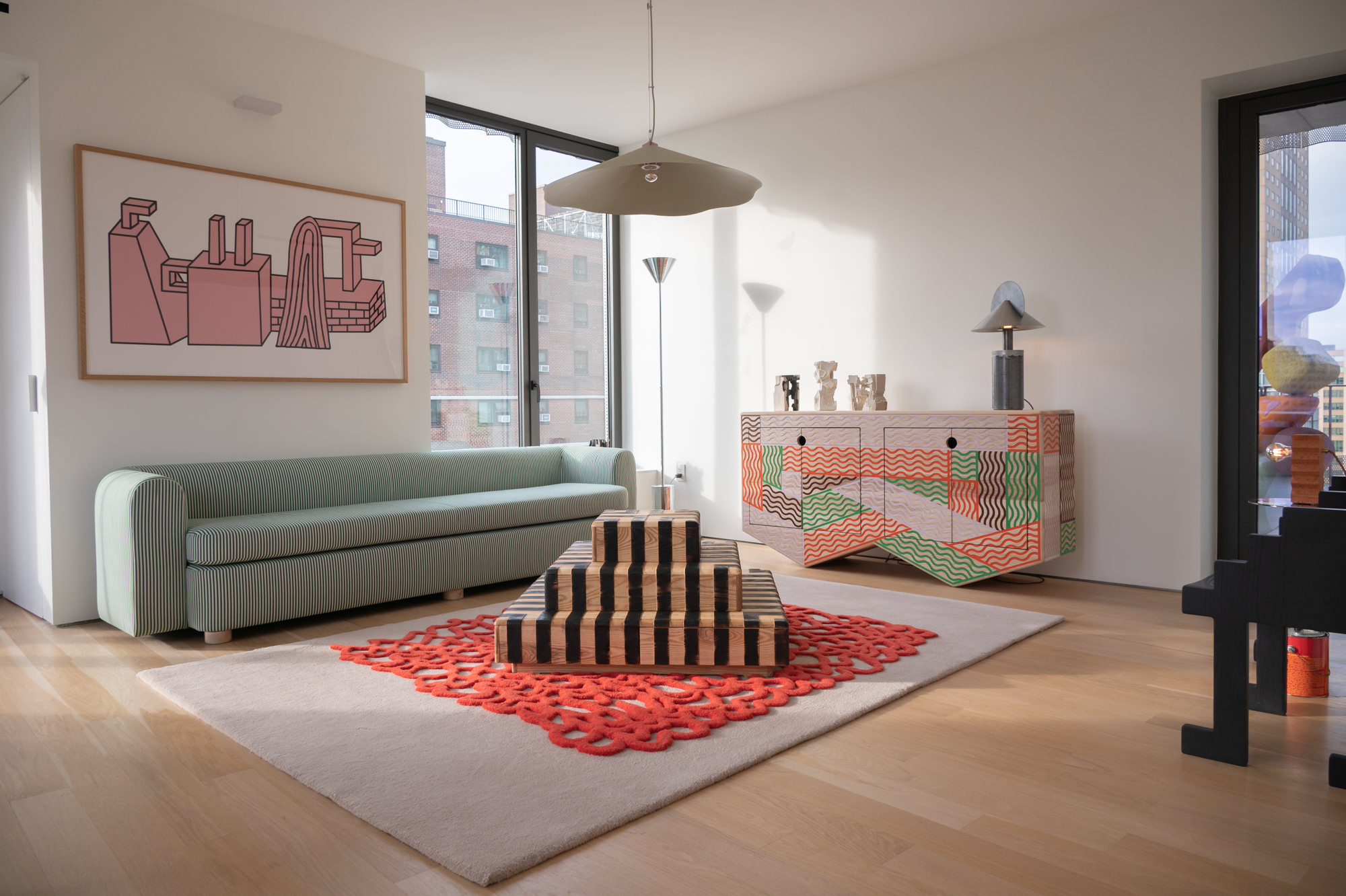Furniture and lighting from Estudio Persona occupies the ground floor lobby. The sofas from the new Abrazo collection favor soft forms that tuck into each other over a rigid structure.