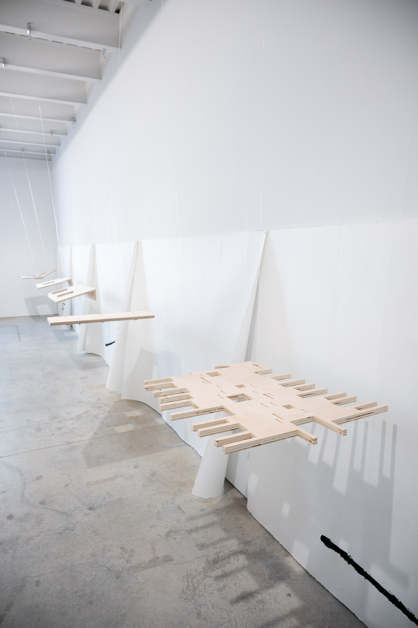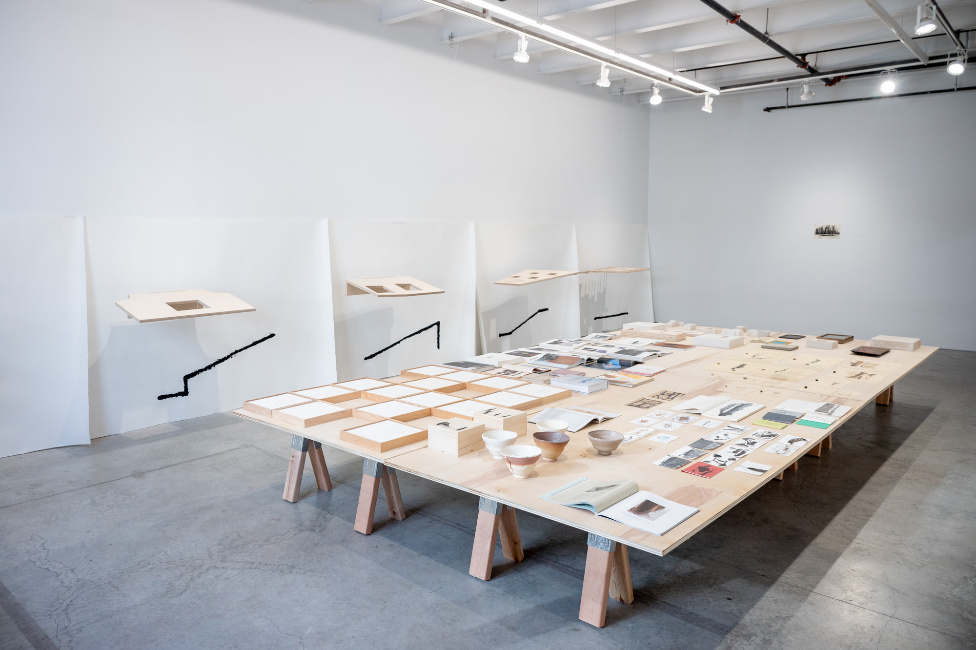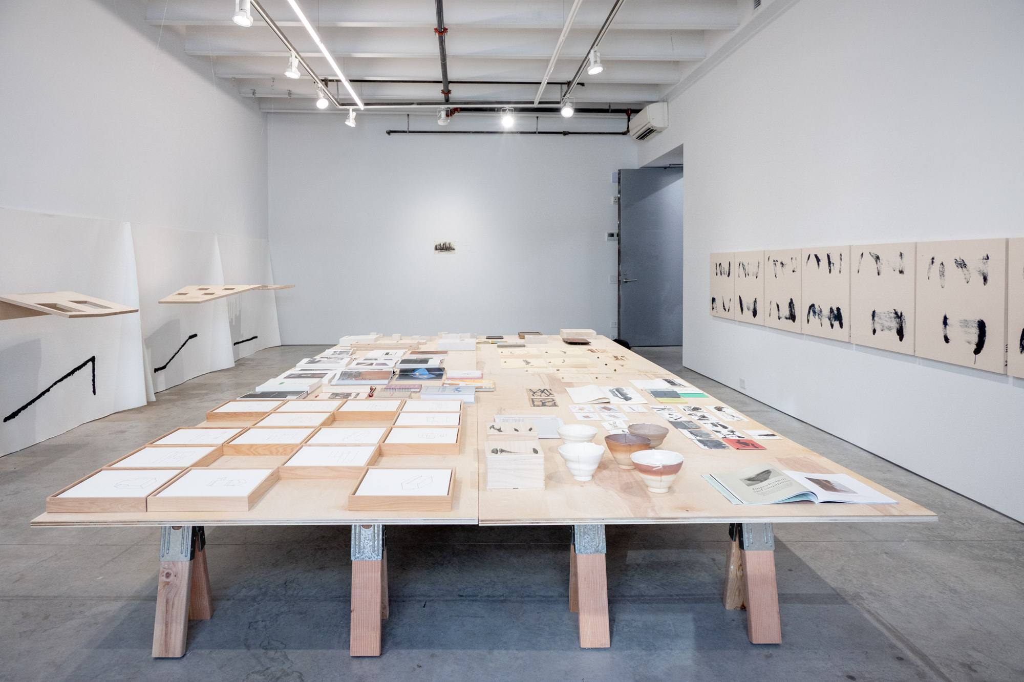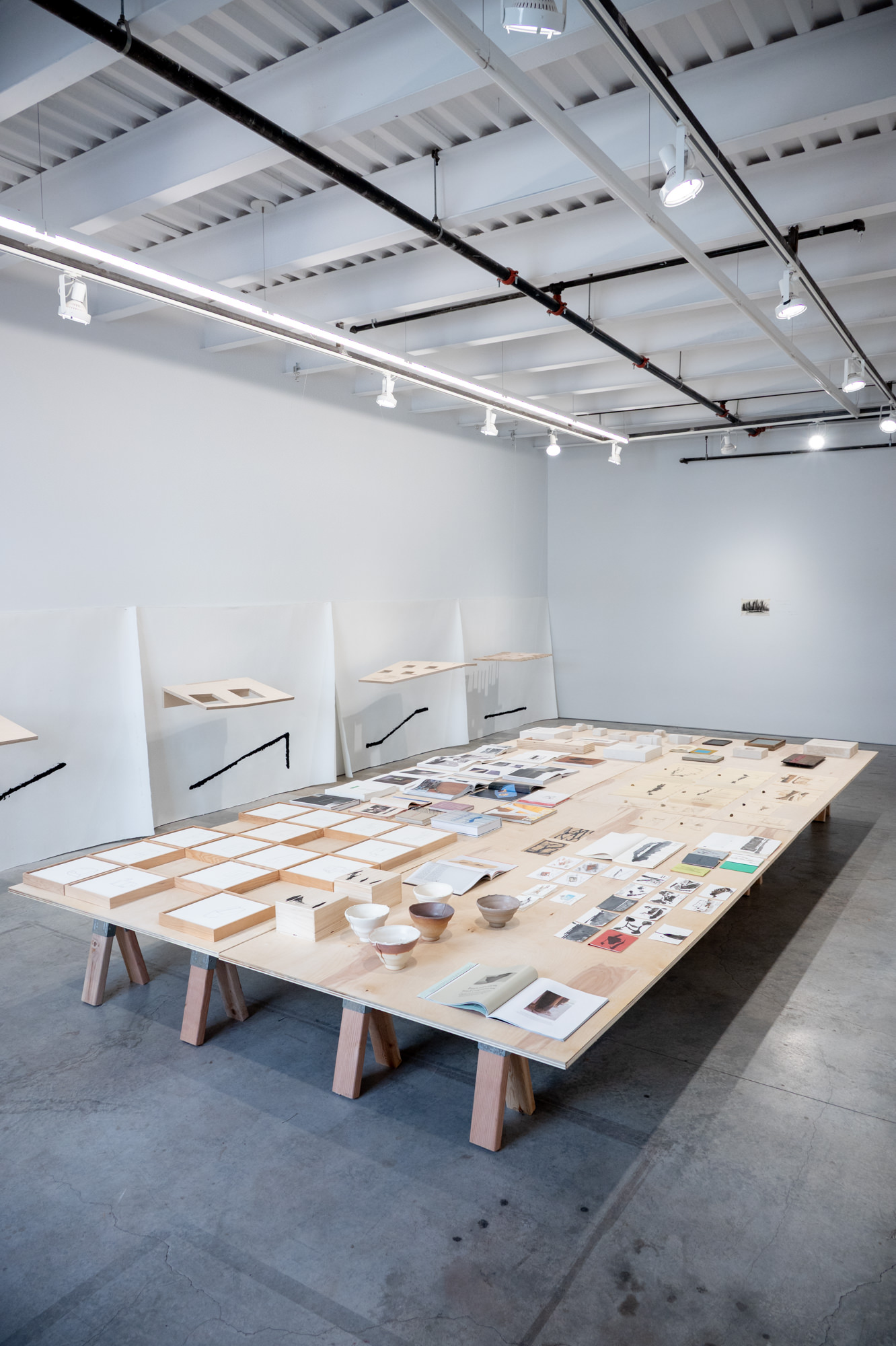 The Low Land presented by Thomas Park occupied one of the upstairs spaces within the ArtCake gallery. The main components of the exhibition are a series of suspended plywood form study models and a large low table filled with sketches, models, design publications and ceramic vessels. It’s what you might find wandering around the office of an architectural firm, presented here in an orderly composition. There’s a humbleness to all the work shown here, a search for reduction and simplicity.