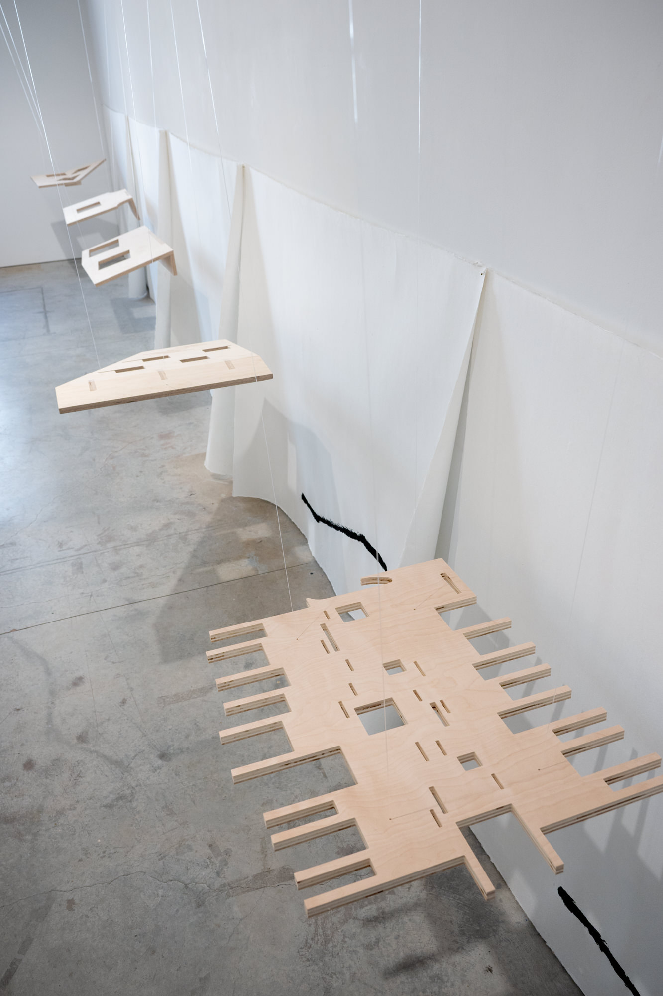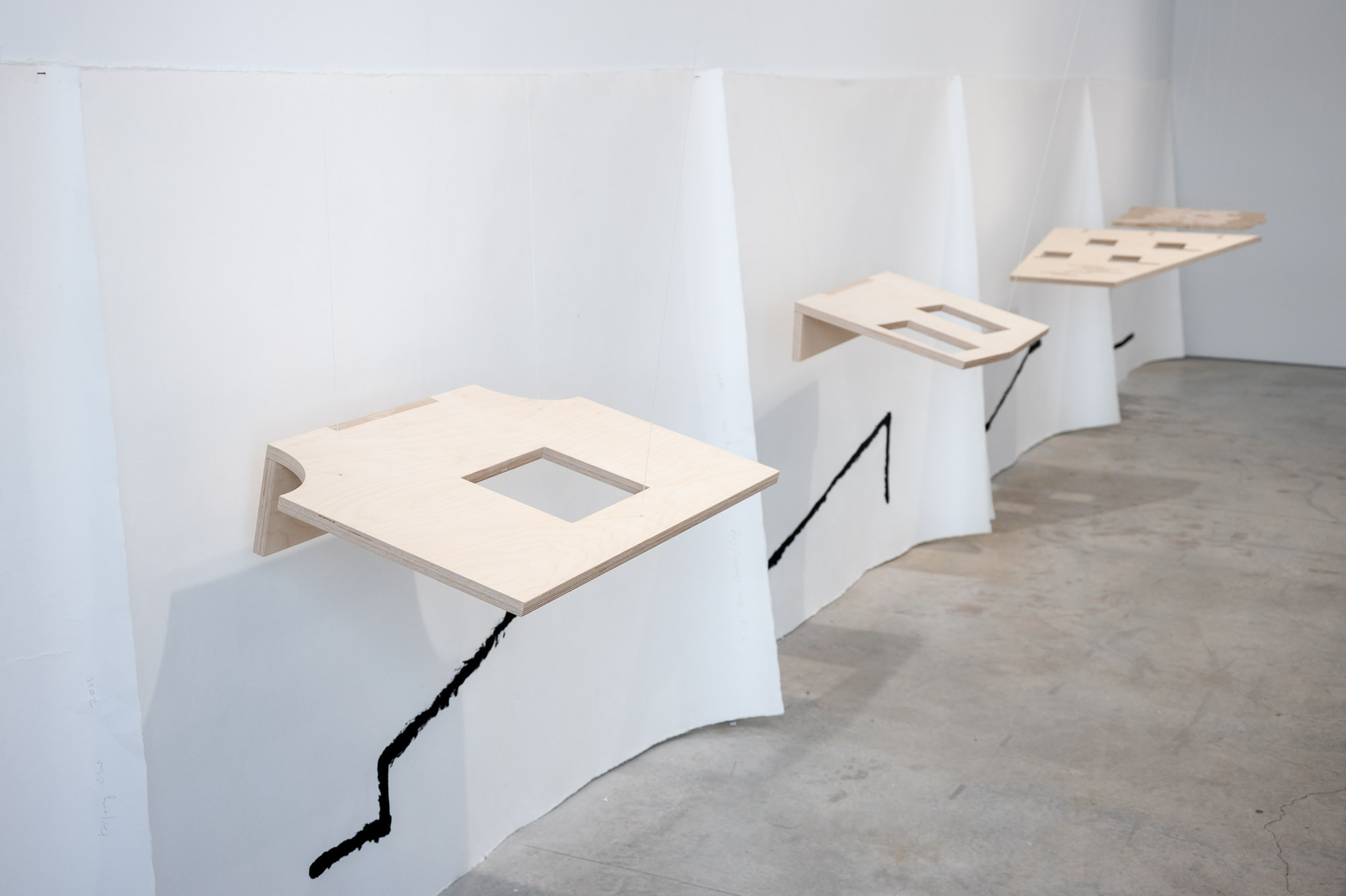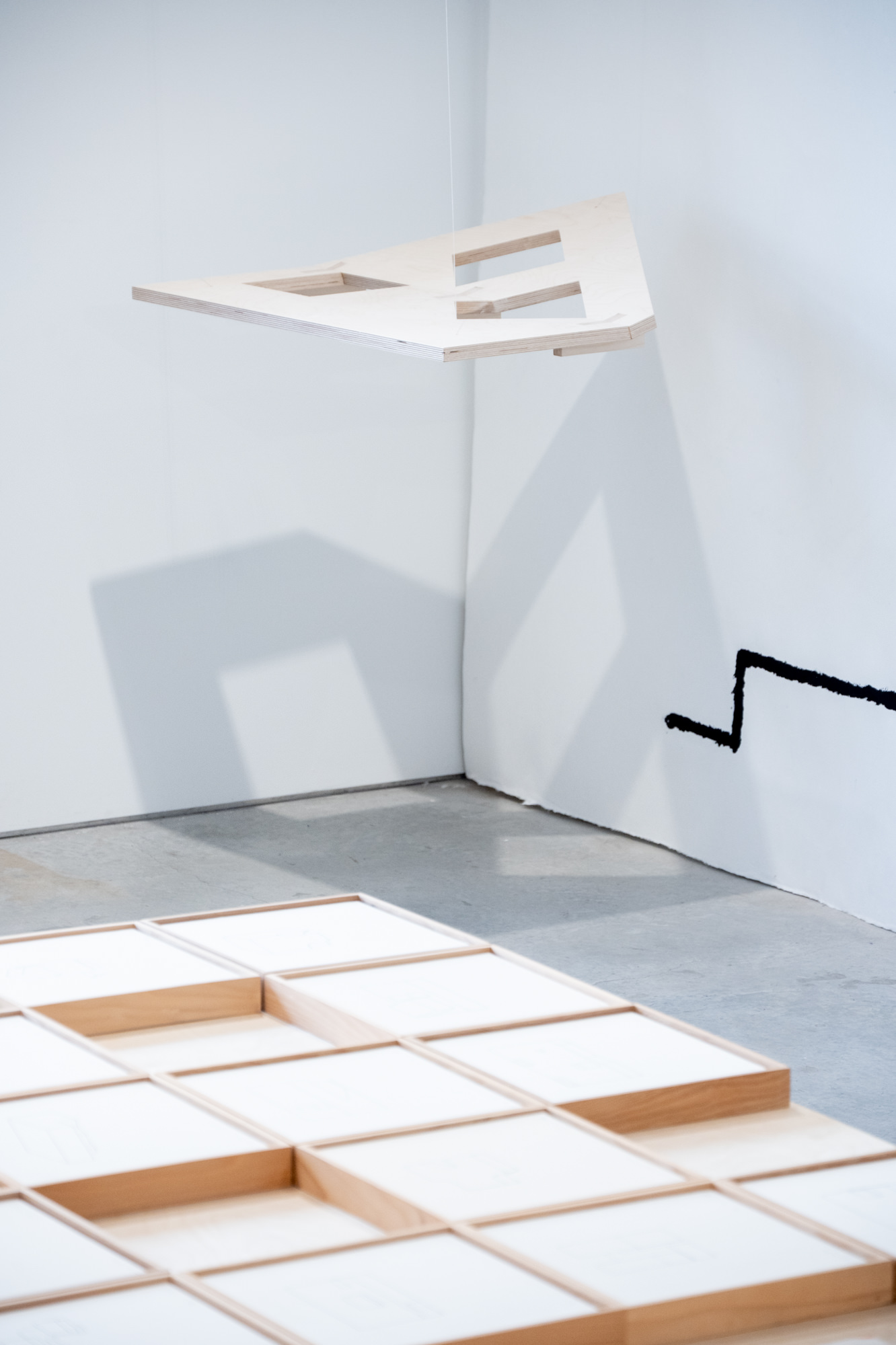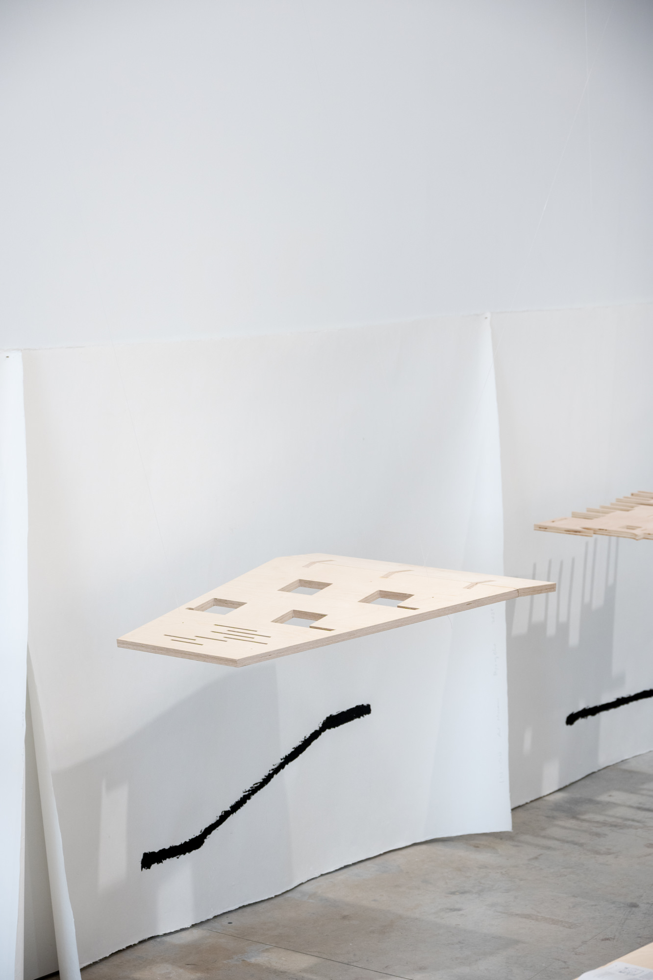The Low Land presented by Thomas Park occupied one of the upstairs spaces within the ArtCake gallery. The main components of the exhibition are a series of suspended plywood form study models and a large low table filled with sketches, models, design publications and ceramic vessels. It’s what you might find wandering around the office of an architectural firm, presented here in an orderly composition. There’s a humbleness to all the work shown here, a search for reduction and simplicity.