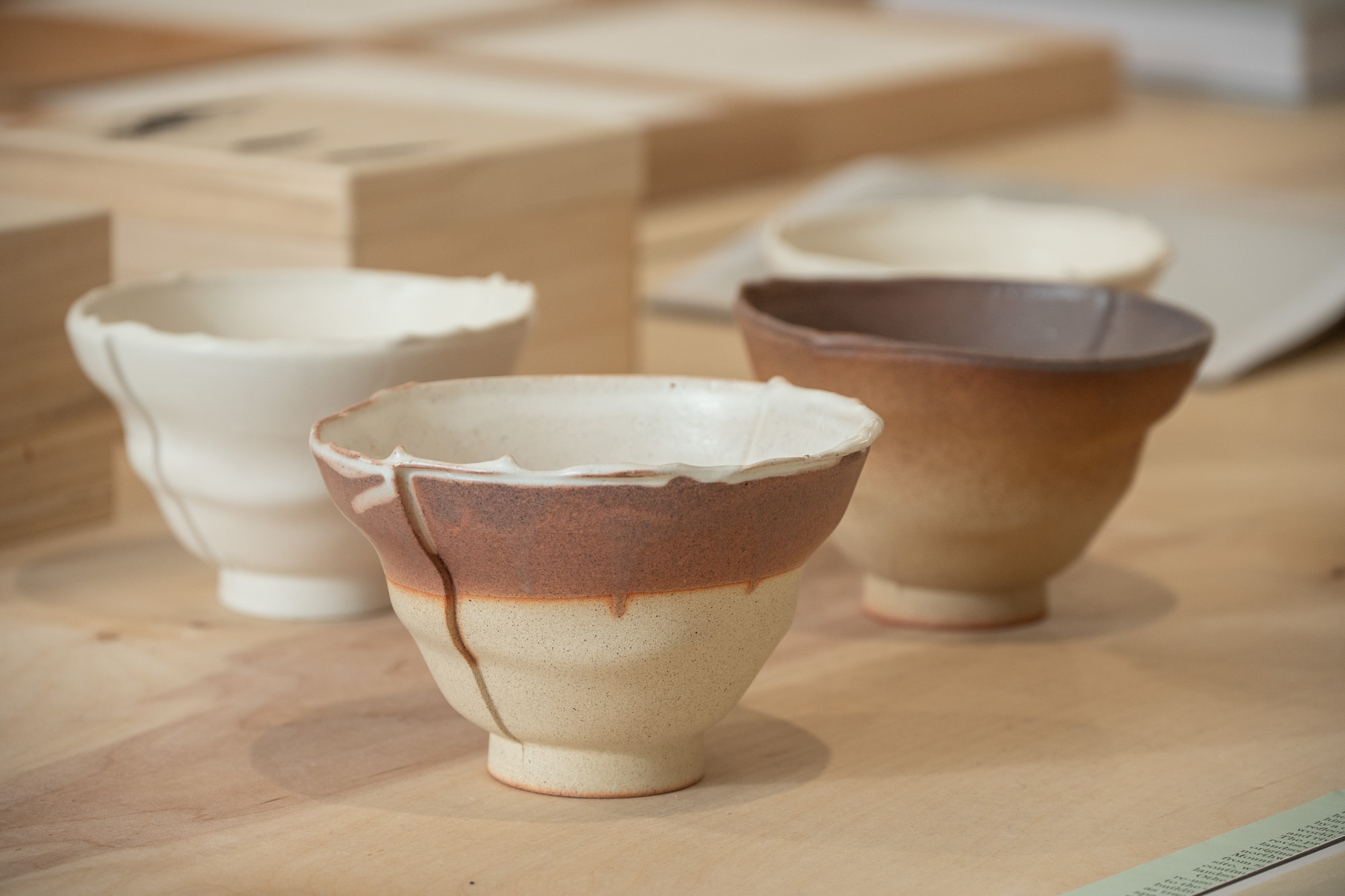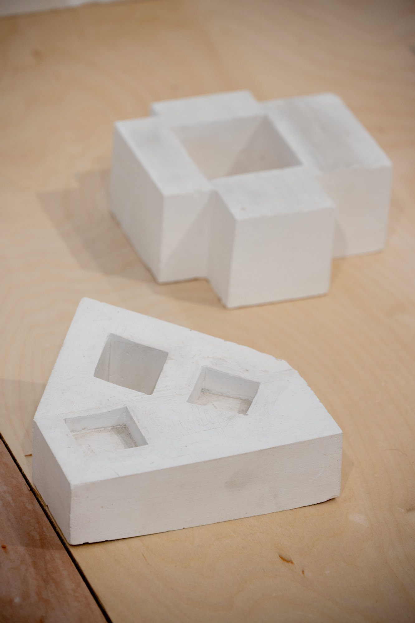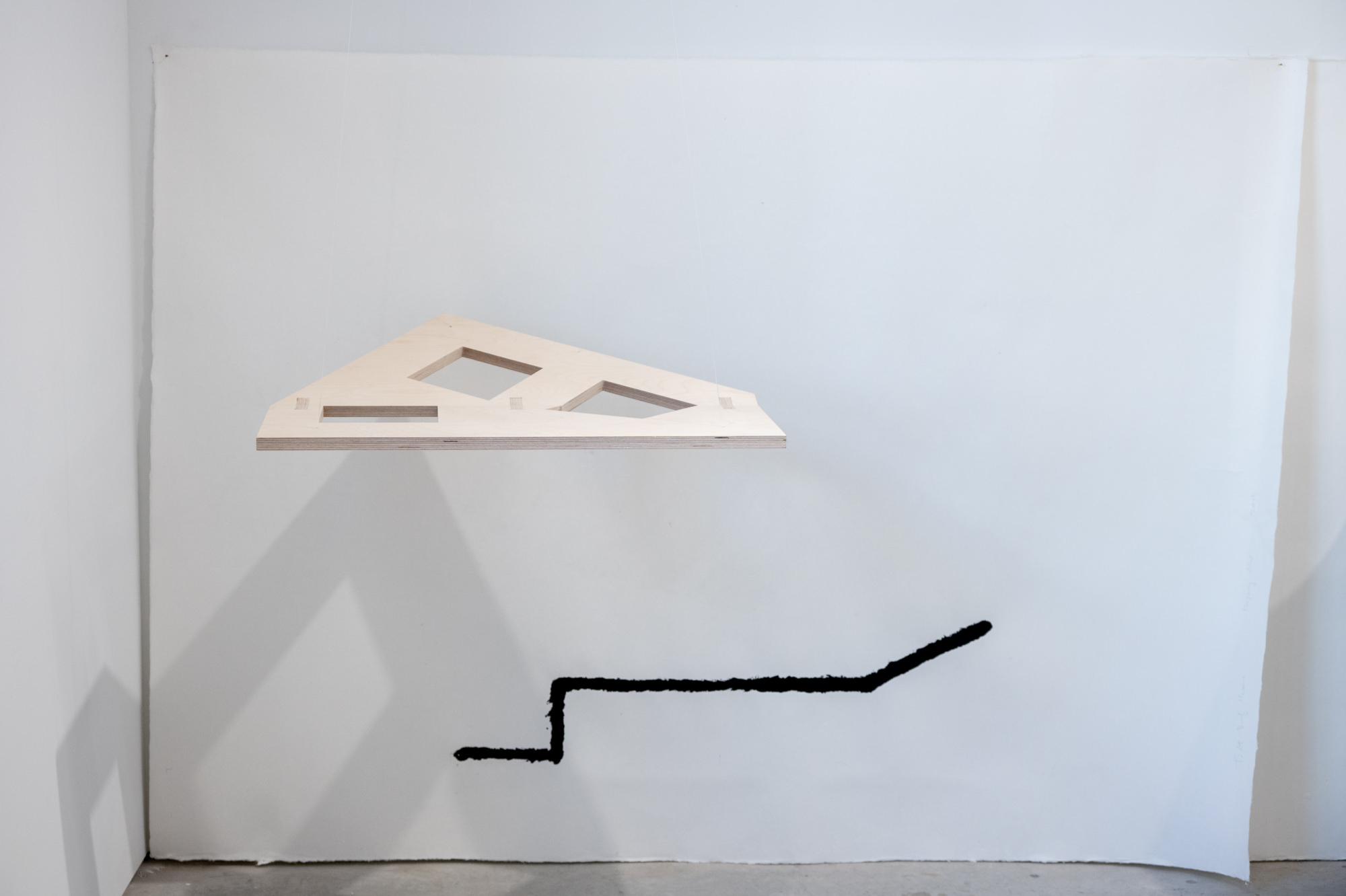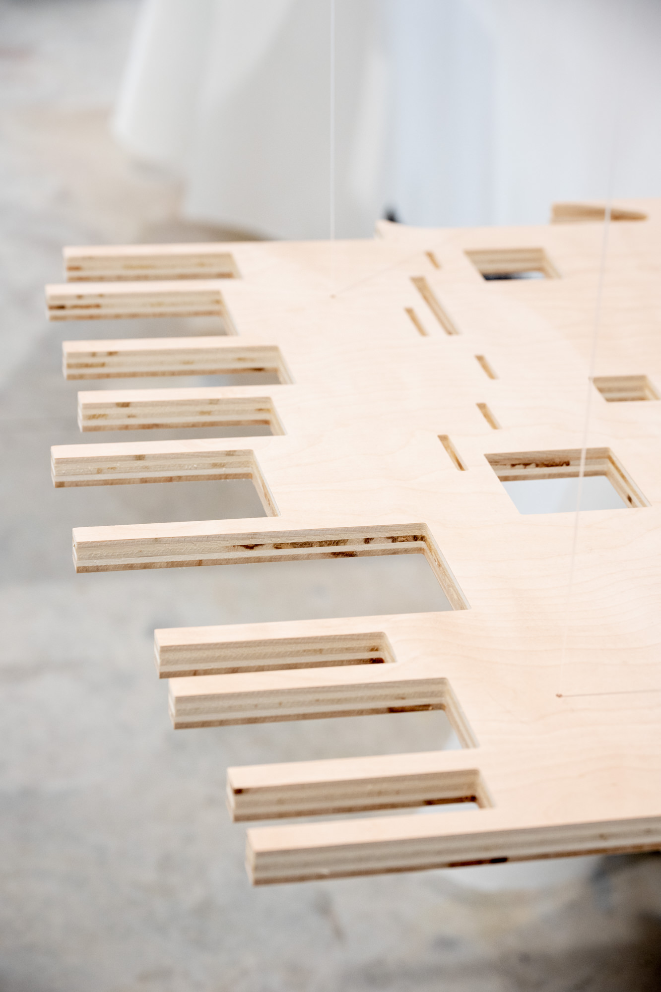 The Low Land presented by Thomas Park occupied one of the upstairs spaces within the ArtCake gallery. The main components of the exhibition are a series of suspended plywood form study models and a large low table filled with sketches, models, design publications and ceramic vessels. It’s what you might find wandering around the office of an architectural firm, presented here in an orderly composition. There’s a humbleness to all the work shown here, a search for reduction and simplicity.