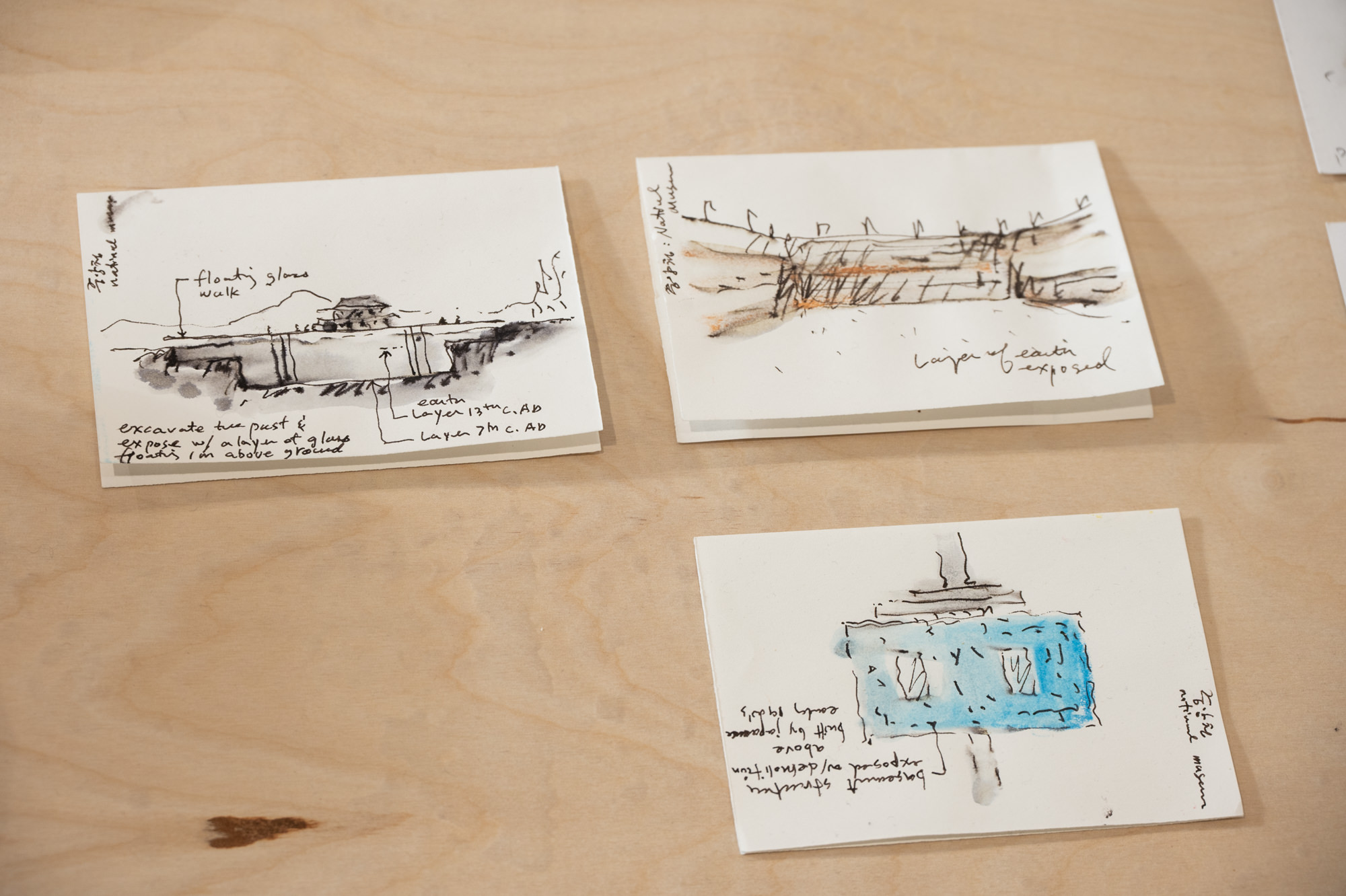 Commercial architecture project presentations these days are pretty much REVIT models and high gloss CG renderings and animations. Little artistic soul remains. For a brief two week stint near Brooklyn’s Industry City, Seoul-based Byoung Soo Cho Architects presented an array of project sketches, paintings and handmade models that show work made by humans instead of software.