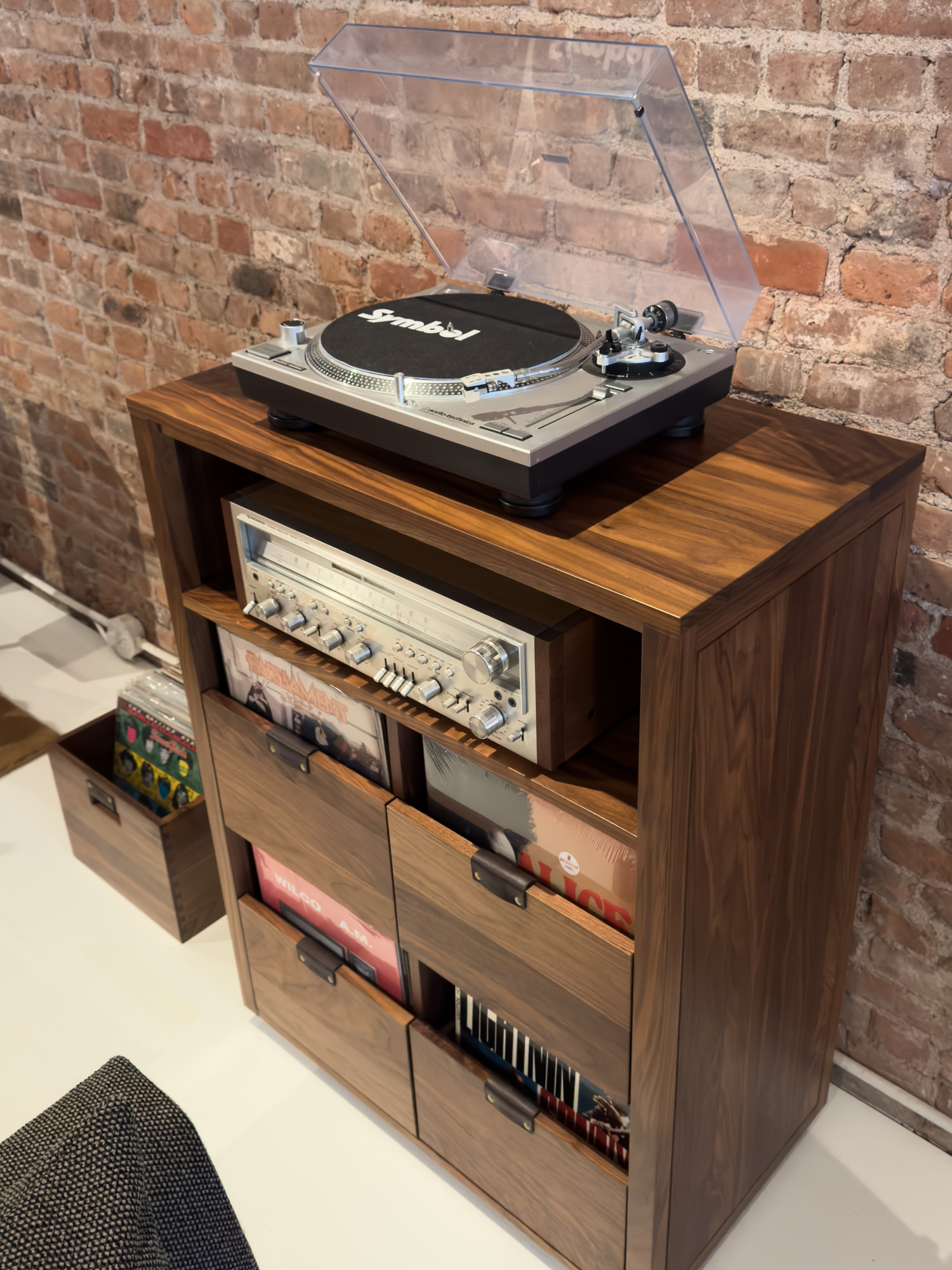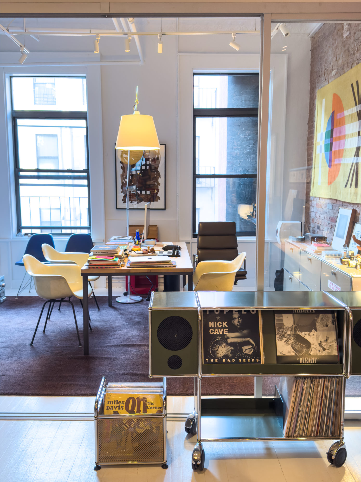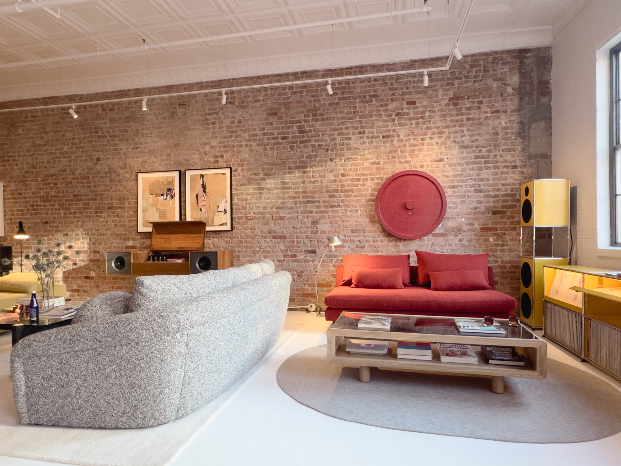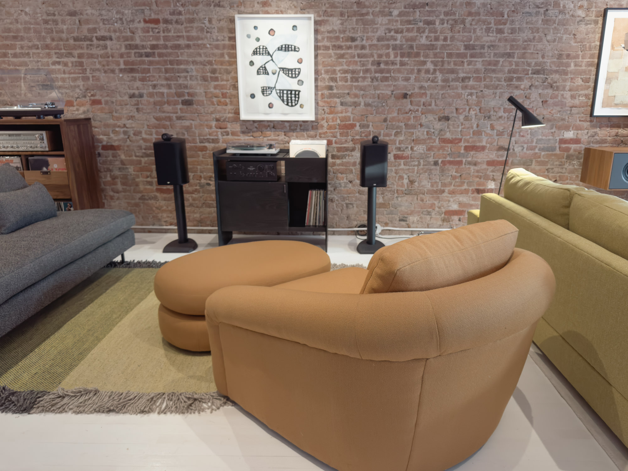 The 3rd floor space on Bowery is a quintessential NYC loft with white painted floor, original exposed brick walls and tin ceiling. The showroom occupies the front and the studio workspace is tucked in the back. The gravitational pull of Symbol’s numerous lounge-style sofas, vintage light fixtures and audio gear are hard to resist for a few hours of chillout album listening. There’s no audiophile pretension or do-not-touch furniture showroom vibes here.