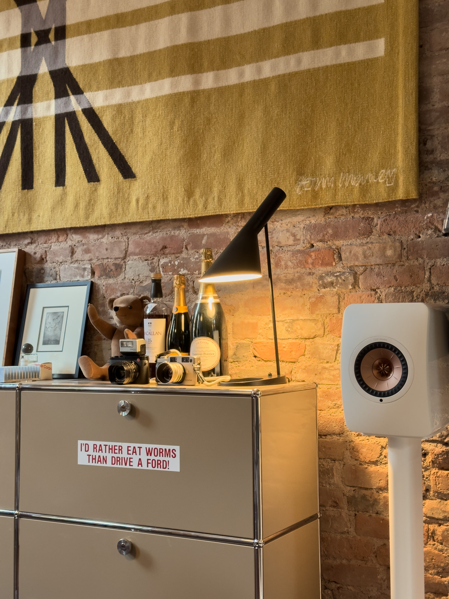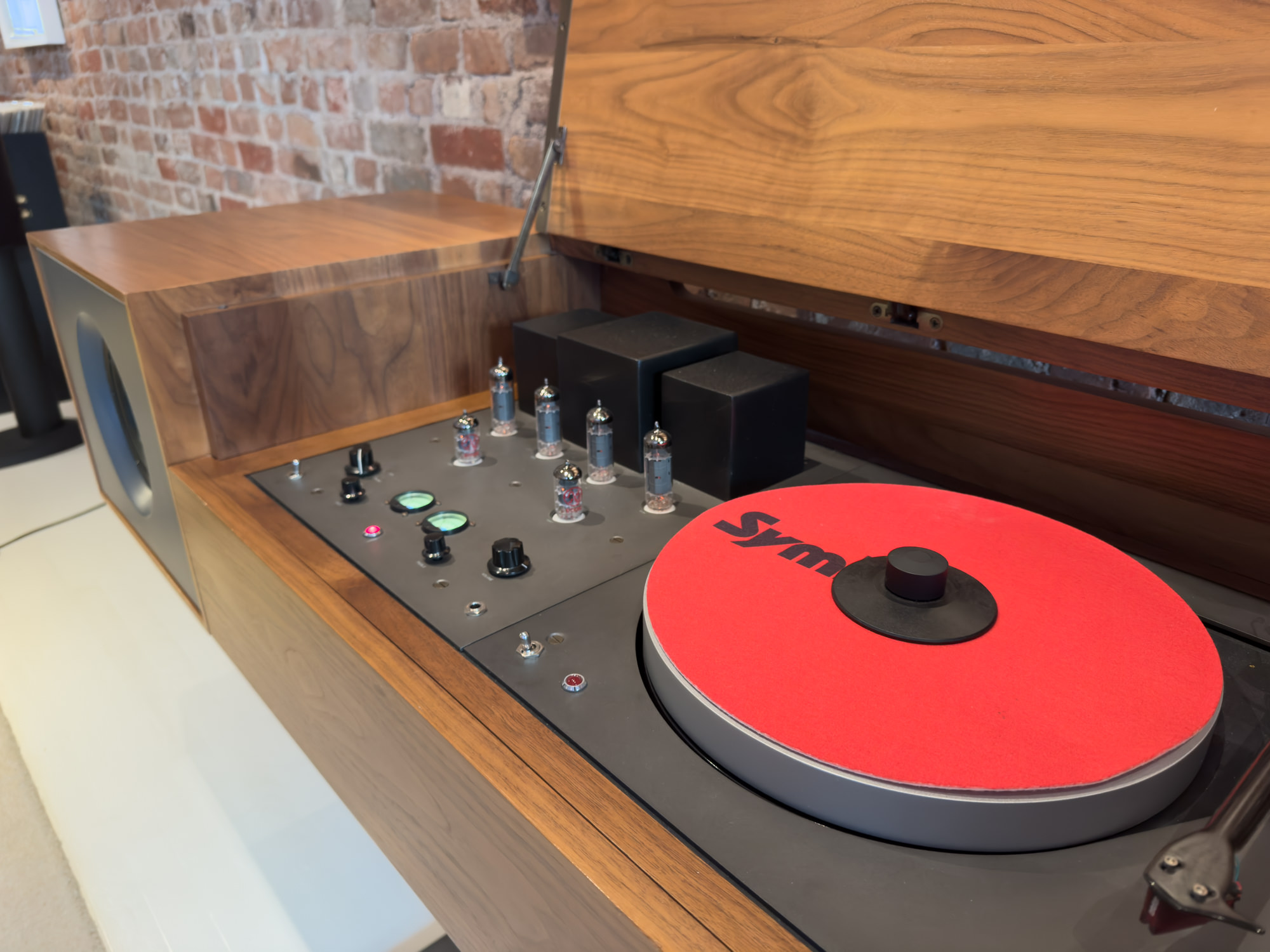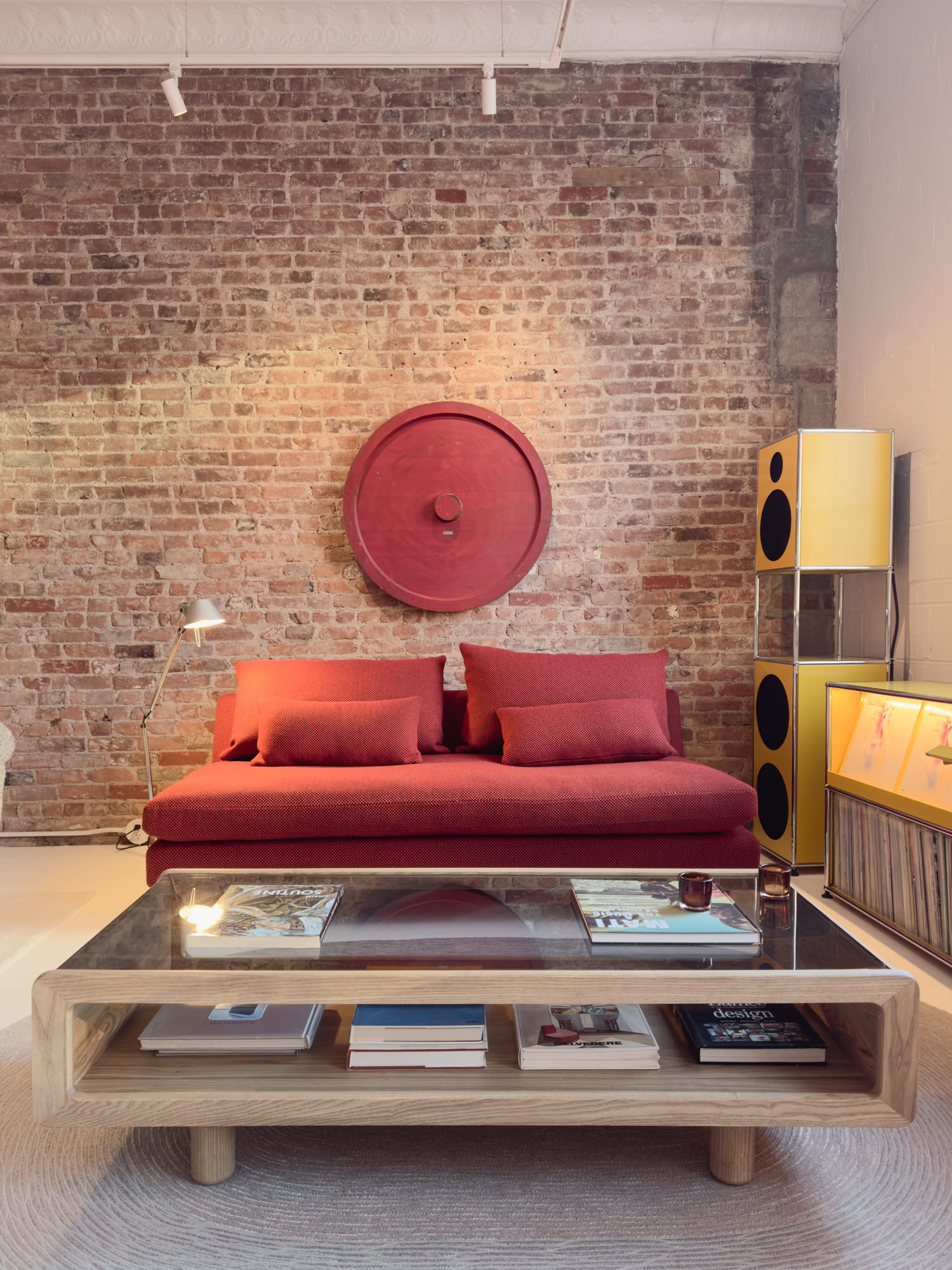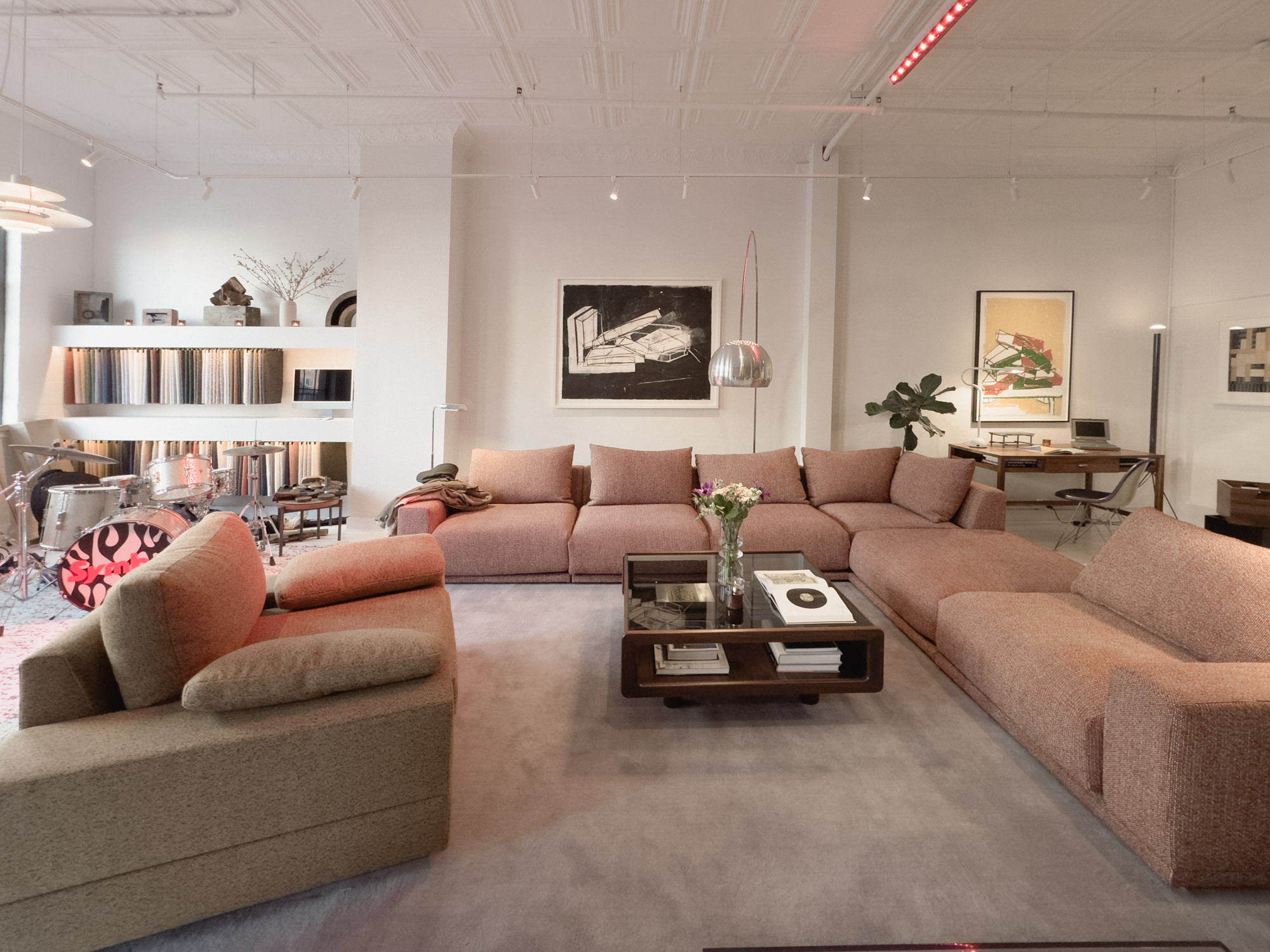 The 3rd floor space on Bowery is a quintessential NYC loft with white painted floor, original exposed brick walls and tin ceiling. The showroom occupies the front and the studio workspace is tucked in the back. The gravitational pull of Symbol’s numerous lounge-style sofas, vintage light fixtures and audio gear are hard to resist for a few hours of chillout album listening. There’s no audiophile pretension or do-not-touch furniture showroom vibes here.